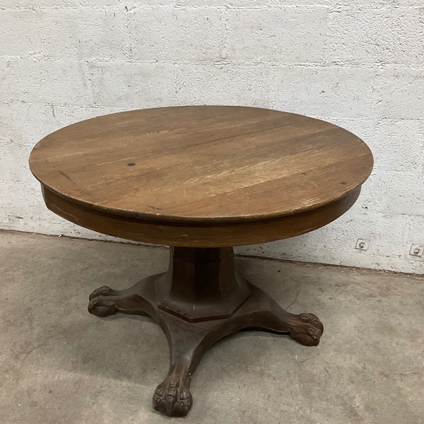 Circular wooden table with pedestal base. Ideal for living rooms or as a decorative accent piece. Features vintage design.