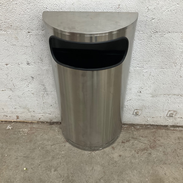 Durable and sleek trash can for commercial spaces. Semi-circular design fits neatly against walls.