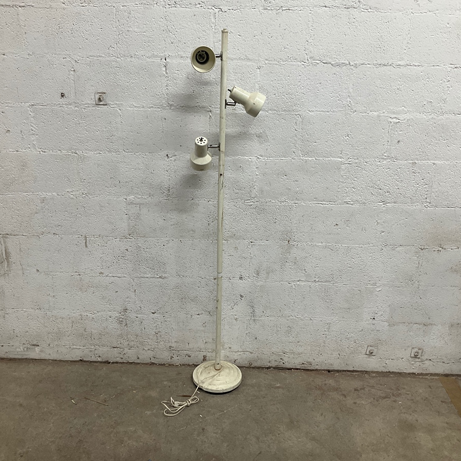 Mid-century modern floor lamp with adjustable shades. Ideal for living rooms or offices. Features metallic construction.