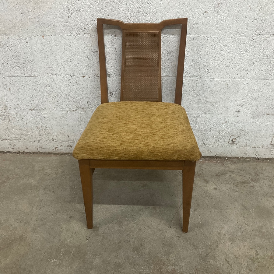 Mid-century modern chair with wood frame and woven back. Ideal for living room or dining area decor.