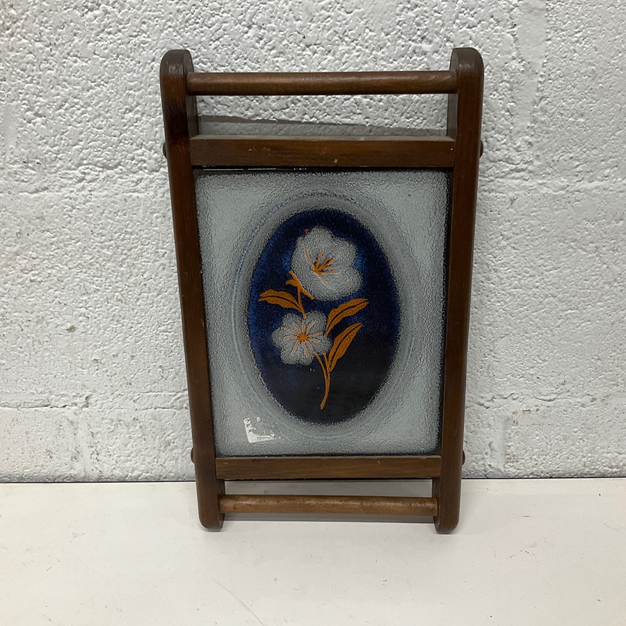 Vintage wooden frame featuring hand-painted floral ceramic tile. Ideal for living rooms or vintage decor.