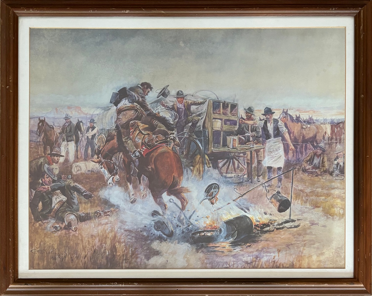 Artist: Charles Marion Russell (1864-1926). Vintage Western painting depicting a lively chuckwagon scene at camp. Perfect for rustic or West...
