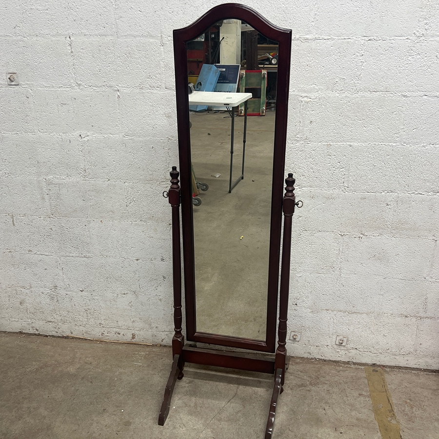 Elegant antique cheval mirror with mahogany wood frame. Ideal for bedrooms or dressing areas.
