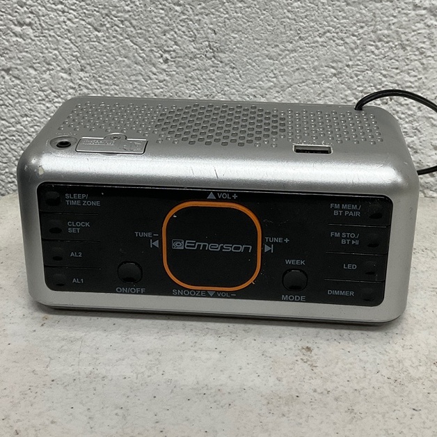 Silver Emerson alarm clock radio with digital display, AM/FM tuning, and snooze function. Ideal for bedrooms.