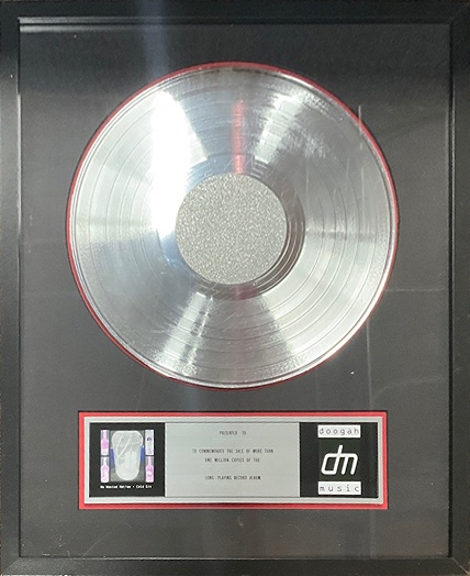 A commemorative framed silver record plaque for long-playing record album sales, featuring a metal plate & protective glass cover.