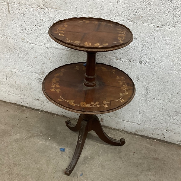 Elegant vintage wooden table with two tiers and decorative inlay, ideal for living rooms or hallways.