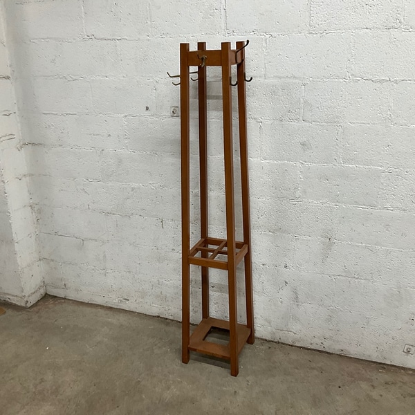 Tall wooden coat rack with multiple hooks, ideal for entryways and hallways, featuring a classic design.