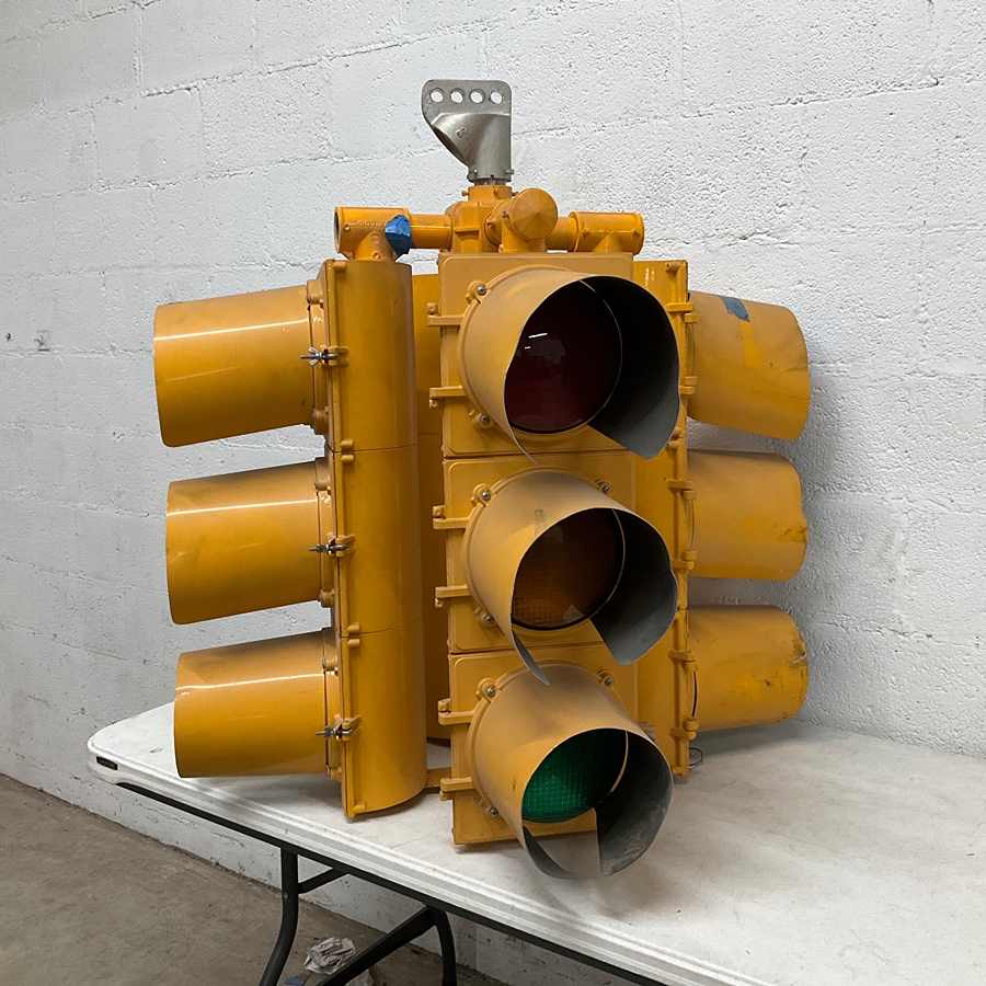 A vintage yellow traffic light from the mid-20th century with six sockets, ideal for industrial decor or collection.