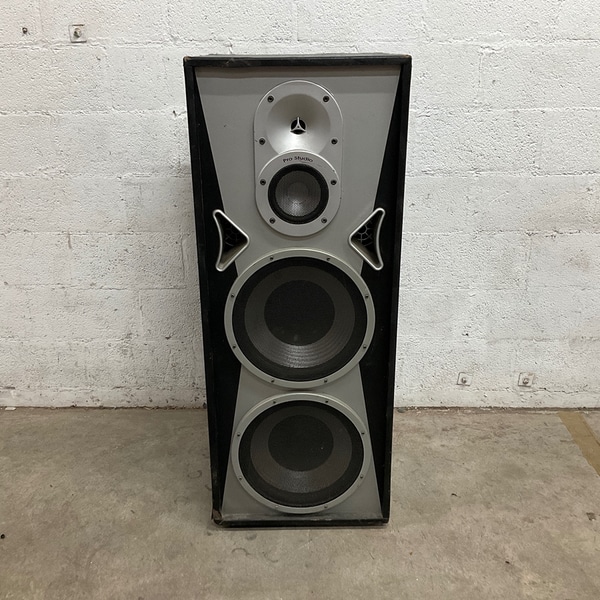 Vintage floor standing speaker with large sound drivers, ideal for home audio setups. Retro design with durable construction.