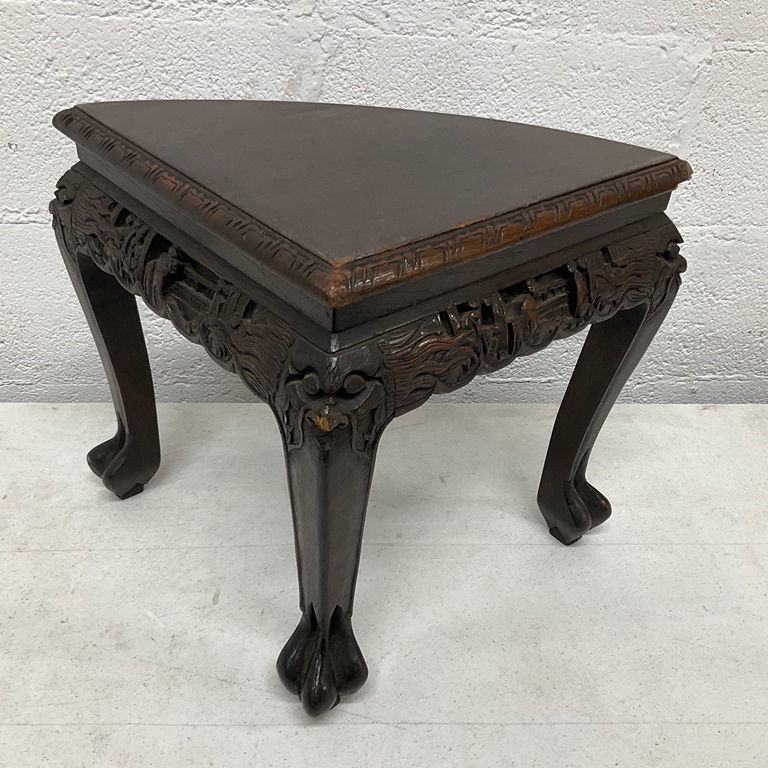 Triangular wooden table with intricate carvings, ideal for living rooms or vintage decor. Made from solid dark wood.