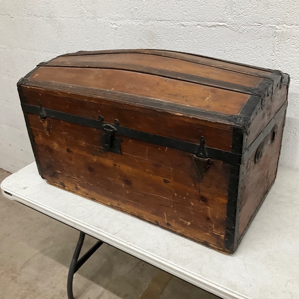 Antique wooden steamer trunk with metal accents. Great for storage or decorative use in living rooms or bedrooms.