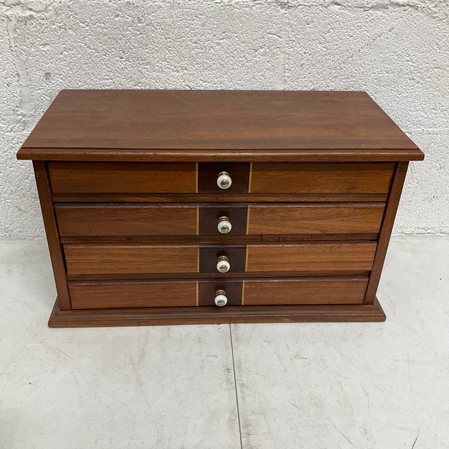 Mid-century wooden jewelry chest with four drawers and round handles. Ideal for decorative bedroom storage.