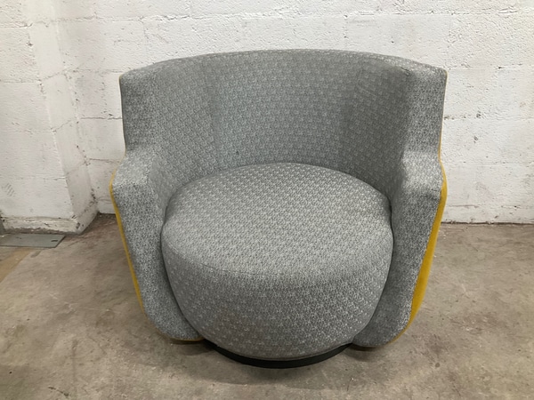 Round swivel accent chair featuring mid-century modern design. Ideal for living rooms and lounges. Wool blend upholstery.