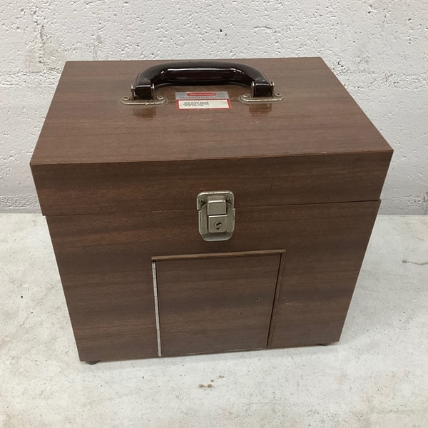 Retro wooden storage box with handle and latch closure, ideal for home or office storage needs.