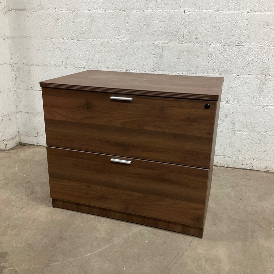 Modern filing cabinet with two drawers, ideal for office storage. Made from brown wood with a sleek design.