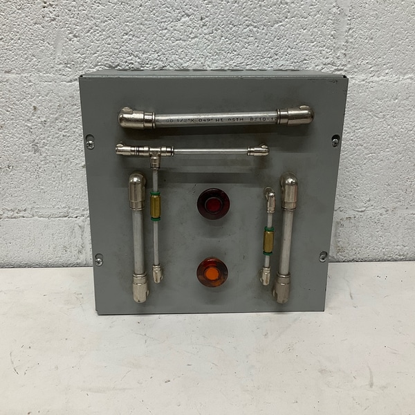 Vintage industrial control panel with metal pipes and indicator lights, ideal for retro spaces.