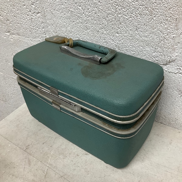 Retro hard case suitcase perfect for travel or storage. 1960s style with sturdy handle and clasps.
