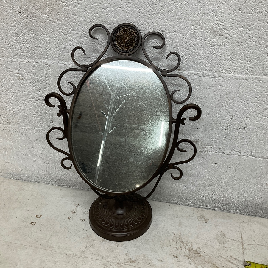 Vintage oval table mirror with ornate metal frame and base. Ideal for dressing tables or vanities. Adds a classic touch to any room.