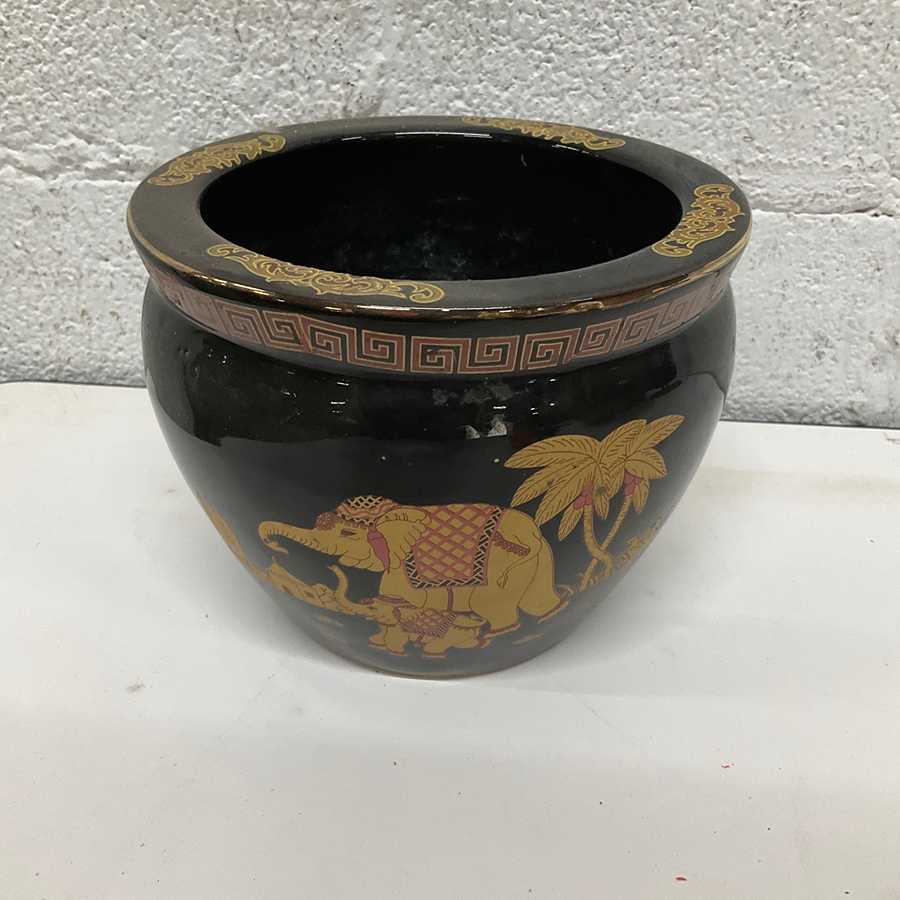 Black and gold ceramic pot with elephant and palm tree design. Perfect for living room decor or plant display.