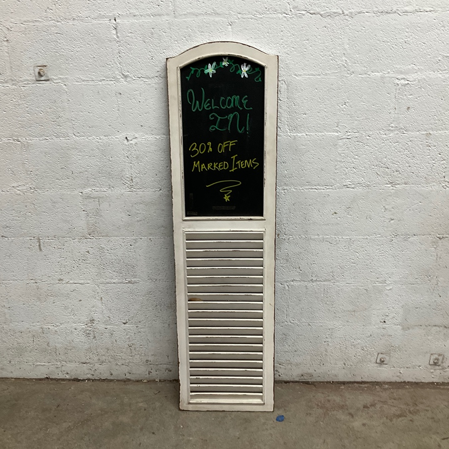 Rustic vintage chalkboard with louvered panel. Ideal for kitchens or cafes, featuring wooden construction.