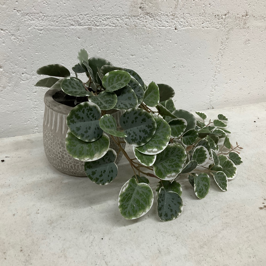 Green vine plant with variegated leaves in a textured gray pot. Ideal for indoor decor in living rooms or offices.