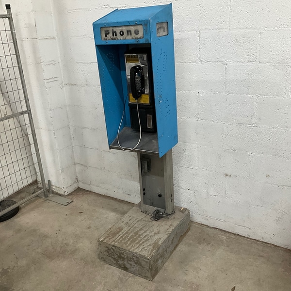 Retro blue payphone booth from the mid-20th century, perfect decorative piece for vintage-themed interiors.