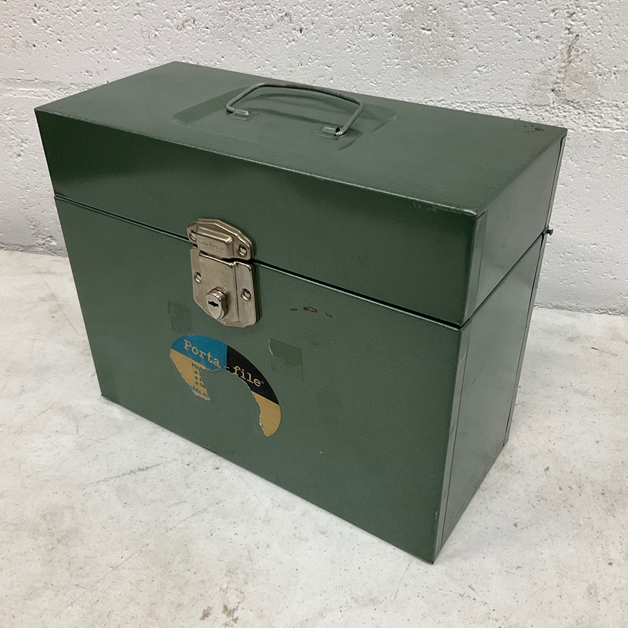 Vintage 1960s green metal file box with secure lock and handle. Ideal for storing documents and office supplies.