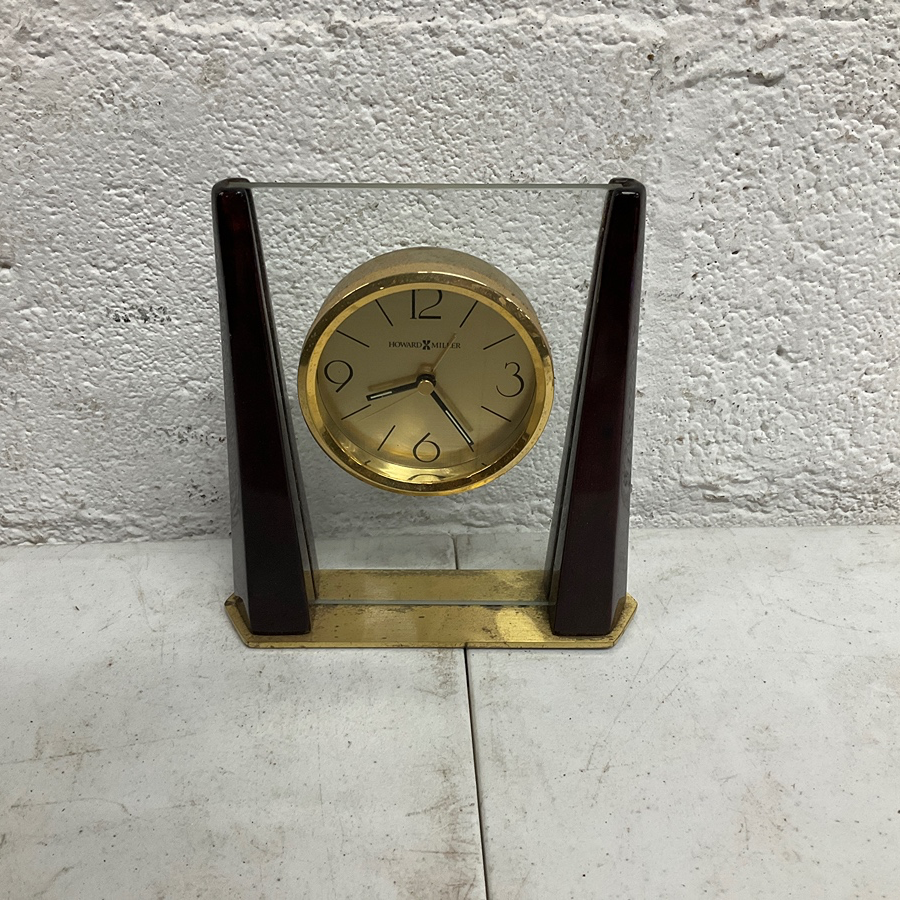 Elegant vintage desk clock featuring a gold dial. Ideal for office or living room decor. Mid-century modern style.