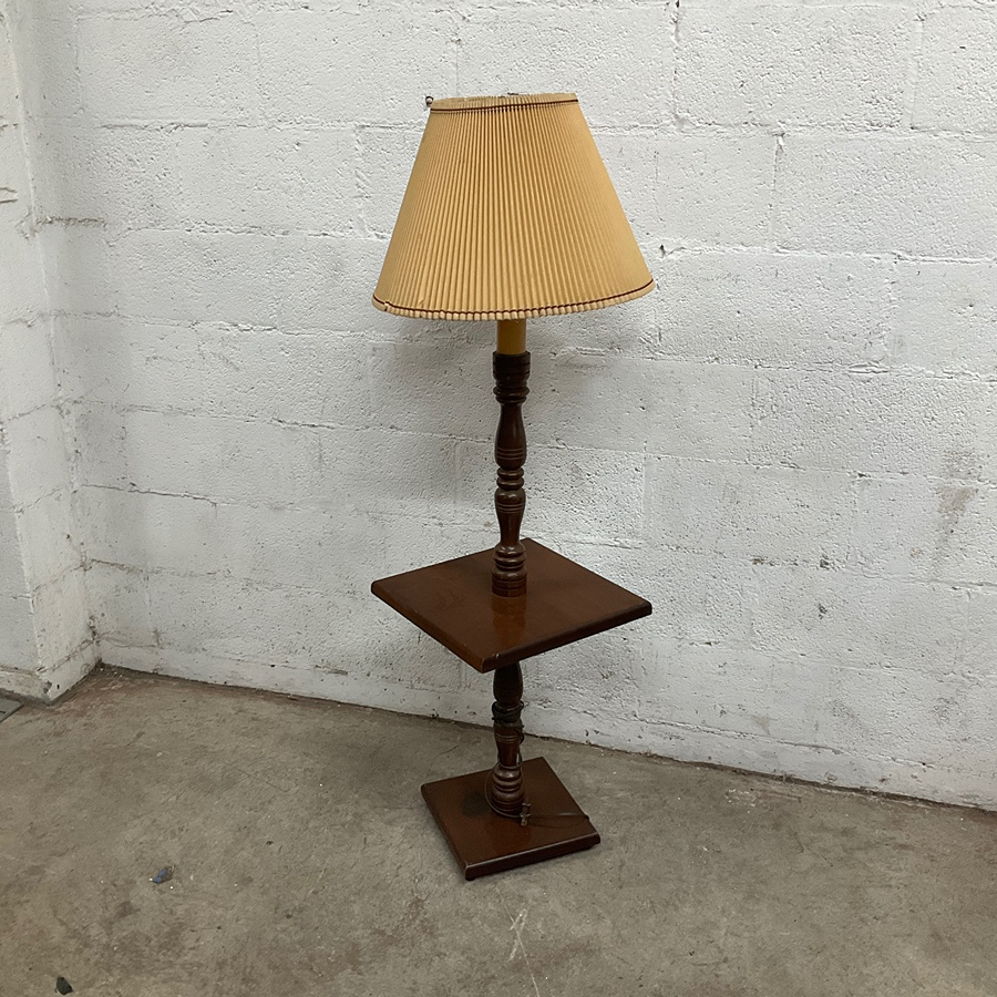 Vintage wooden floor lamp with built-in shelf and pleated lampshade. Ideal for living rooms or studies. Mid-century style.