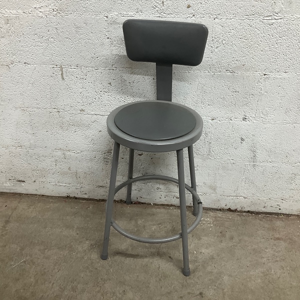 Stylish gray industrial metal bar stool for kitchens or bars. Features a round seat with backrest and footrest.