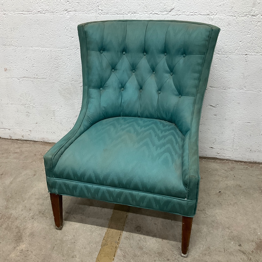 Turquoise upholstered cocktail chair from the mid-century modern era. Features tufted back and wooden legs, ideal for living rooms or lounge...