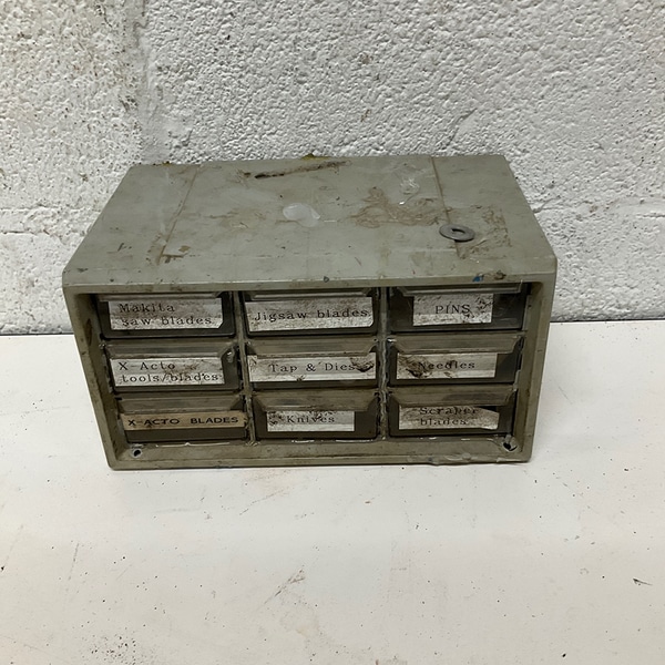 Compact vintage storage unit for tools and small items. Ideal for workshops or garages. Made of metal.