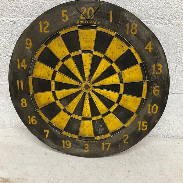 1950s Sportcraft dartboard with classic black and yellow design. Ideal for game rooms or retro decor.