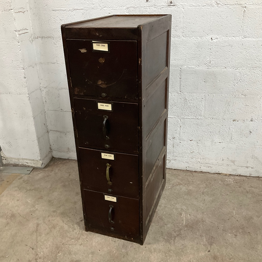 1920s wooden filing cabinet. Sturdy with four drawers. Ideal for office or home organization in a retro style.