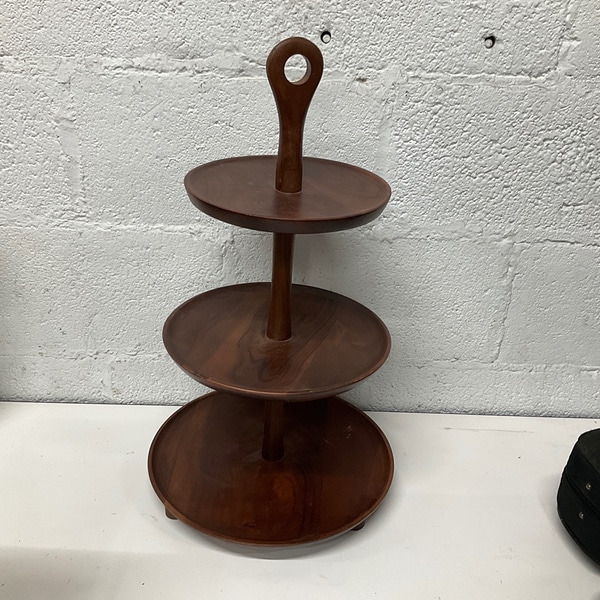 Elegant wooden serving tray with three tiers and a central handle. Perfect for displaying desserts or appetizers in dining rooms.