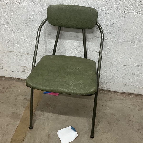 Classic 1960s green chair with a cushioned seat and backrest, metal frame. Perfect for adding a retro touch to any room.