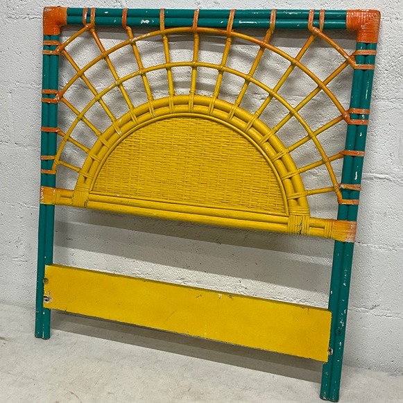 Vibrant 1980s rattan headboard with a sunburst design. Ideal for adding a retro touch to bedrooms.