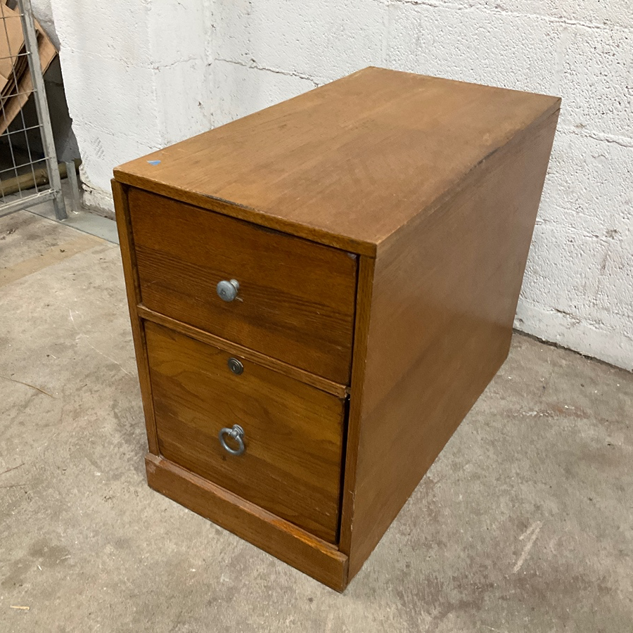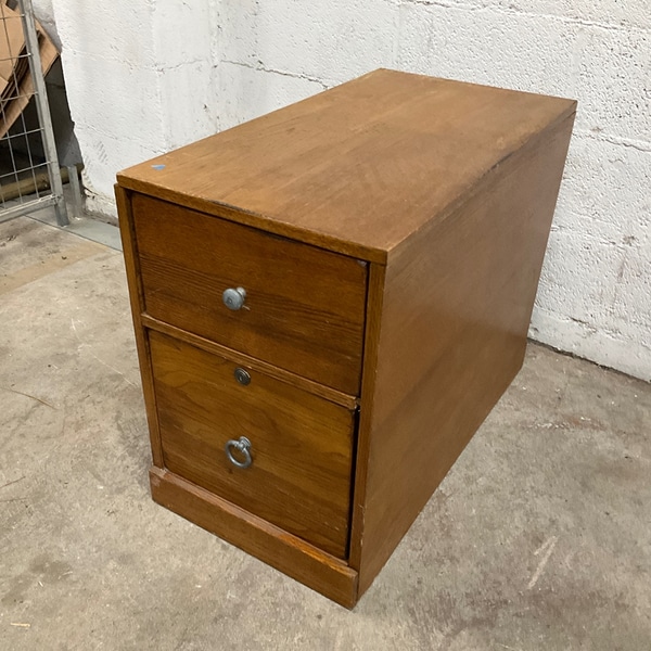 Classic wood filing cabinet with two drawers and metal handles. Perfect for home or office organization.