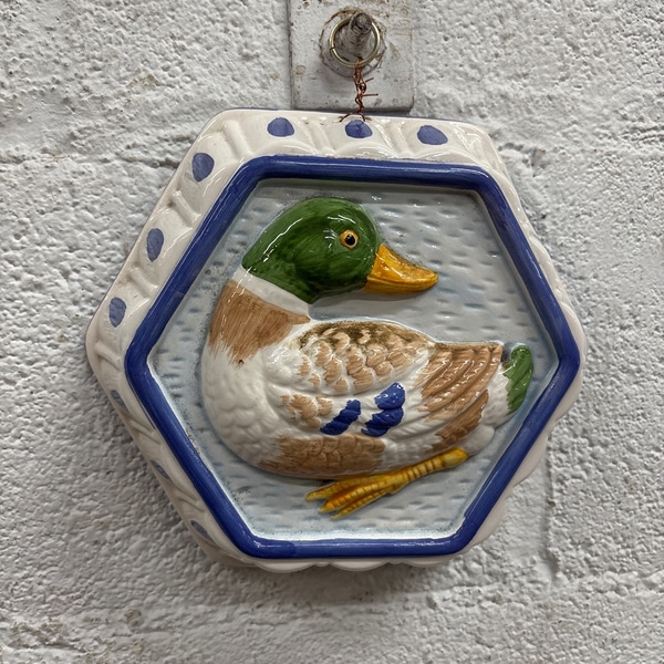 Vintage ceramic wall plaque featuring a colorful duck design. Ideal for rustic or country-style kitchens or dining areas.