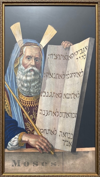 Henry Schile. Framed painting depicting Moses with the Ten Commandments, featuring Hebrew text and intricate details.
