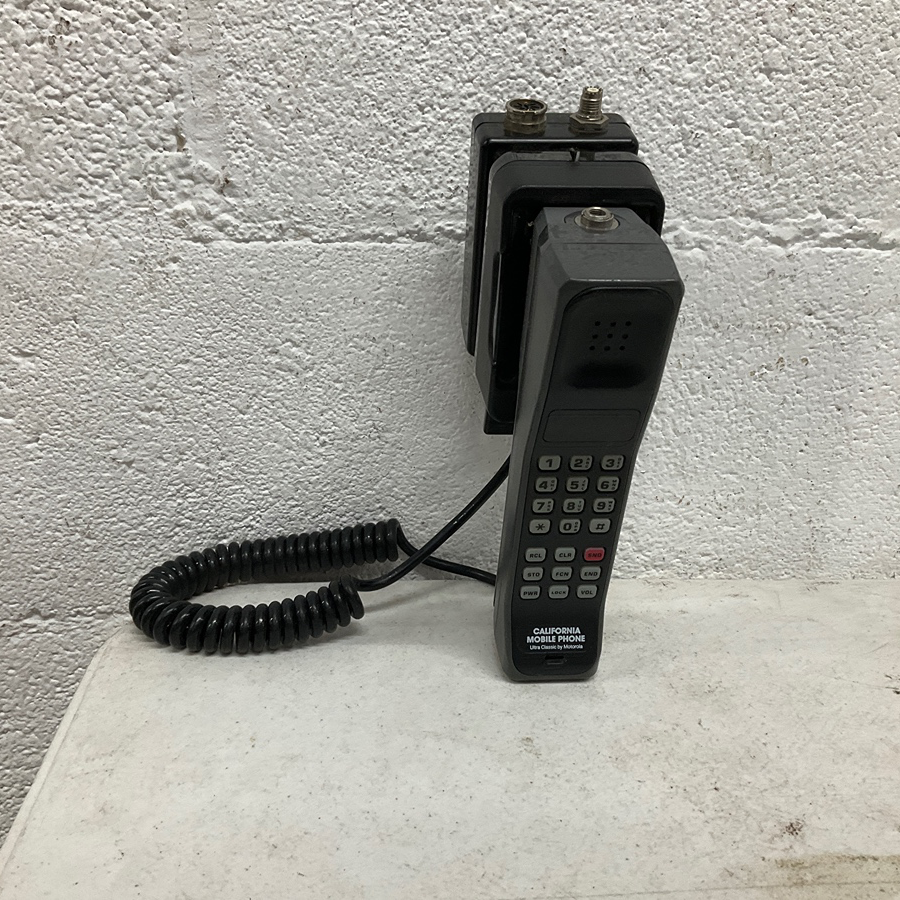 Classic vintage corded brick style mobile phone. Great as a display piece or prop for retro-themed settings. Battery pack included.