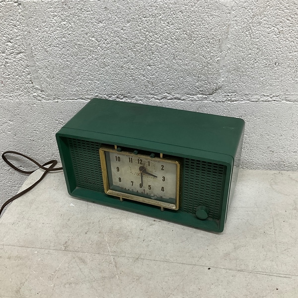 Classic mid-century tabletop clock radio with a green casing, perfect for living rooms or retro decor settings.