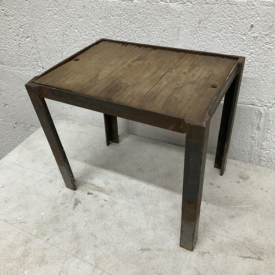 A sturdy table with a wooden top and metal legs. Perfect for industrial or rustic styled rooms.