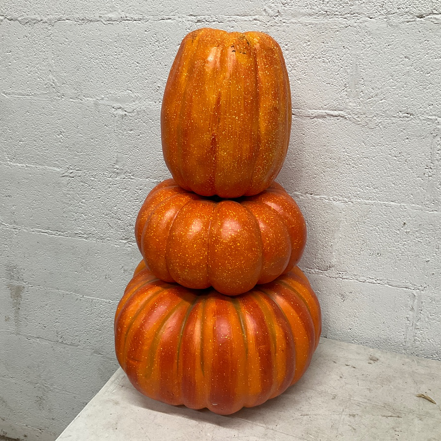 Three faux pumpkins stacked for autumn decor. Ideal for fall displays, Halloween, and Thanksgiving decorations.