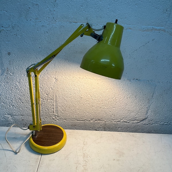 Retro-style lamp with adjustable arm and vibrant green shade. Perfect for study or office spaces.