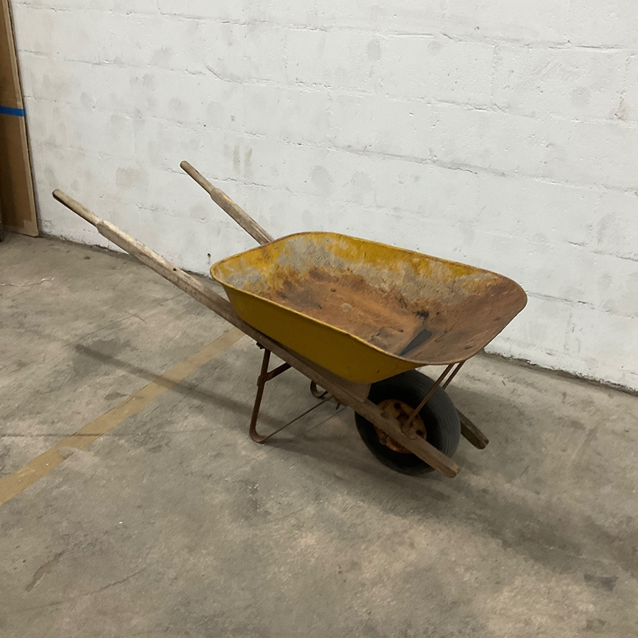 Rustic steel wheelbarrow perfect for garden or farm use. Features a classic yellow design with a single front wheel.