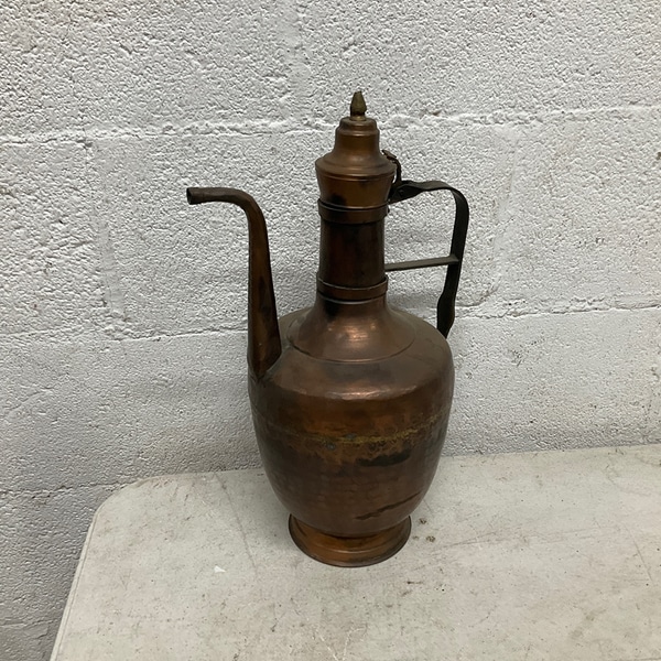Antique copper pitcher with spout and handle for decor or functional use. Ideal for kitchens or historical settings.