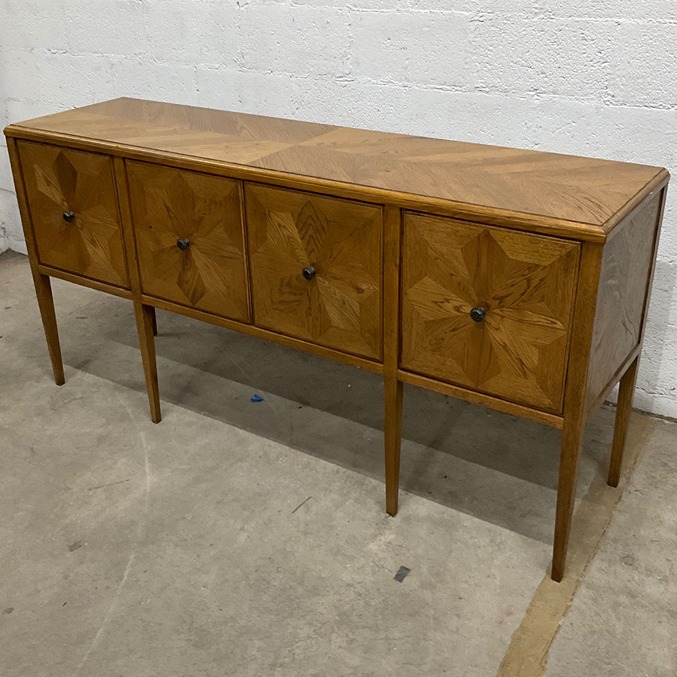 1960s mid-century modern sideboard, made of brown wood. Features four decorative front panels and slender legs. Ideal for living or dining r...