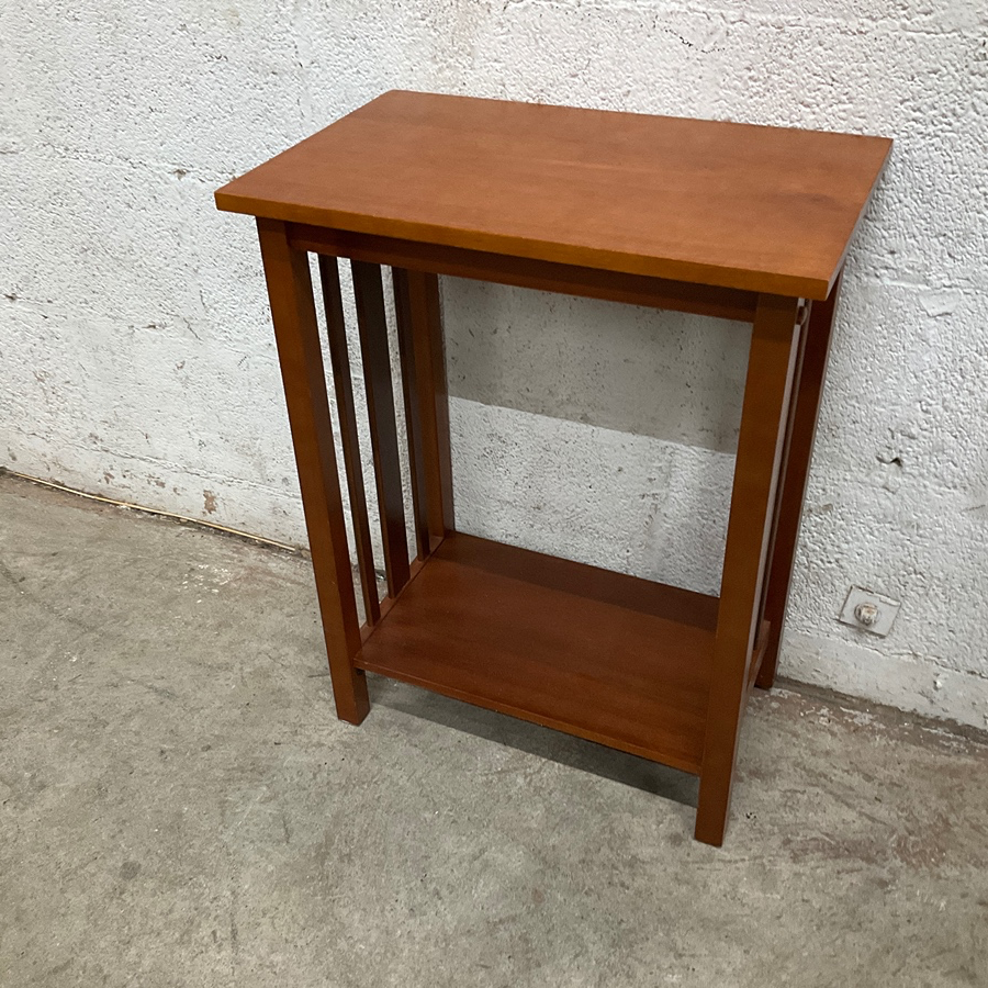 Simple wooden side table with open shelf. Ideal for living rooms or bedrooms. Classic and functional design.