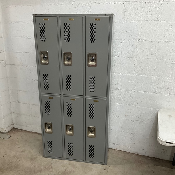 Durable steel locker cabinet with six doors for storage. Ideal for gyms, schools, and workplaces. Vintage industrial style.